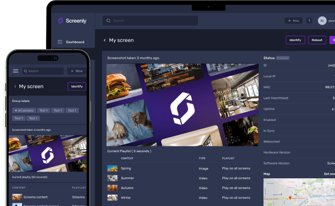 Screenly apporte une solution logicielle et matériel pour répondre à vos besoins de gestion d’écrans d’affichage dynamique à toute échelle. Mettez à jour et programmer du contenu, contrôlez l’état d’un écran et affichez n’importe quel contenu que vous avez probablement déjà.